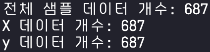 ์ ์ฒด ์ํ์ ์ ๋ฐ X, y ๋ฐ์ดํฐ ๊ฐ์๋ฅผ ํ์ธํด๋ณด๋ ๊ฐ 687๊ฐ์ฉ์ผ๋ก ๋์๋ค. (์ด ์ํ ์๋ 687๊ฐ!)